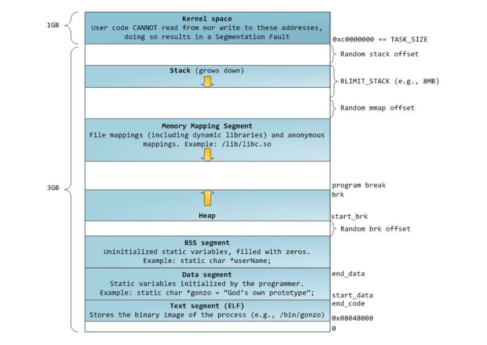 brk通过增加程序中断位置(program break location / brk)从内核中获取内存(非零初始化),最初,堆段的起始(start_brk)和结束(brk)指向相同的位置。