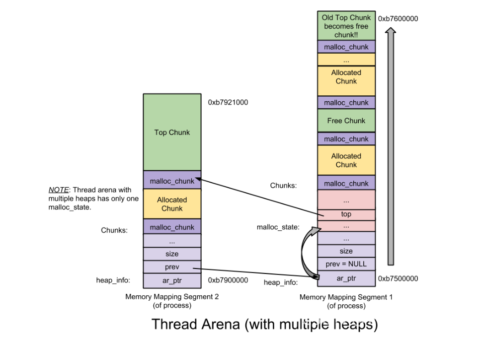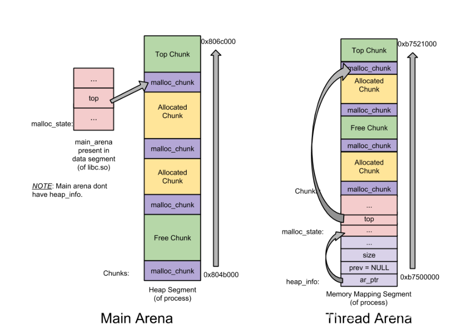 Main arena无需维护多个堆,因此也无需heap_info。当空间耗尽时,与thread arena不同,main arena可以通过 sbrk拓展堆段,直至堆段碰到内存映射段;